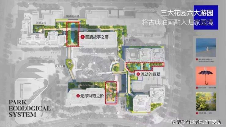绿宝石花园以莫奈《睡莲》为灵感▽▷■,打造约30米长的水景花园;林间溪谷则采用椭圆水池设计,汲取克罗耶《斯卡恩的夏日傍晚-海滩散步》的艺术意境,营造水景与休憩空间的交互体验;城市露台位于6号楼下,面向中兴公园,异域植物环绕的阶梯提供从高向低的景观视野,塑造城市与自然的层次感.