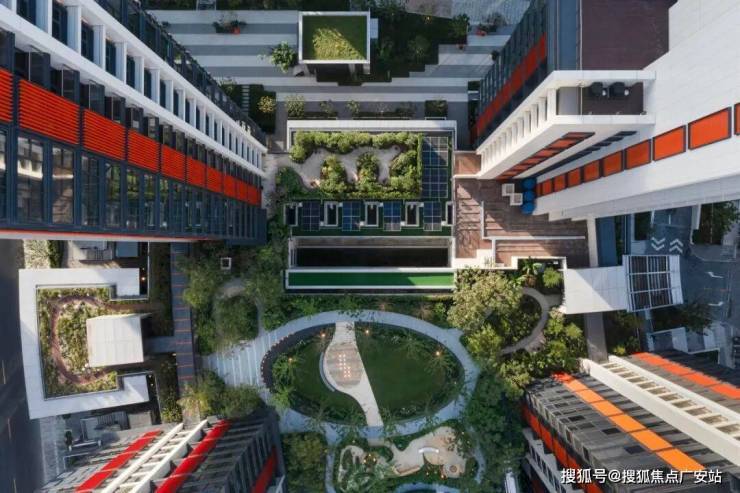 理想之地则为城市构建起“片区级共生系统”.其以6座桥及空中连廊打造『连续慢行系统』,天桥将地块与嘉定新城轨交站点连接,同时地块内设置借鉴高线公园的能量环天桥设计=,联通围绕超级十字路口的四个地块,形成以能量环为核心的空中步行体系,增加社区的活力.