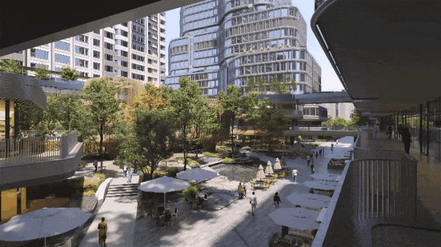置于住宅底层的中央商业公园,以森感公园、九曲花街和花园大道三大主场景为核心,将十米以上(全区30%)高大的乔木、树屋商业及水景巧妙融合,营造自然与商业共生的都会花园街区▷•▲.