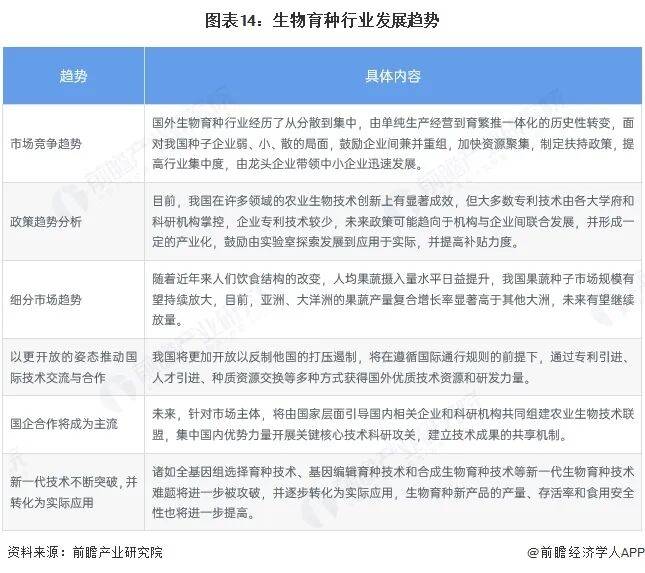 结合行业发展现状△-,中长期时间段内,中国生物育种行业将在龙头企业的引领下不断实现技术突破,在市场需求的作用下加速产品创新向产业化实际应用的进程,行业具体发展趋势如下: