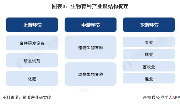 生物育种产业链分为上游、中游、下游三个环节。上游环节包括生物育种所需的研发设备、研发试剂和化肥等材料◇,中游环节分为植物生物育种企业和动物生物育种企业,下游环节主要为农林牧渔业。