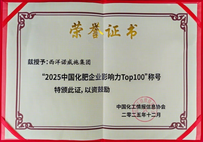 近日,由中国化工情报信息协会主办的“2025化肥行业高质量发展会议暨化肥企业影响力Top100发布会”在湖南长沙举行◇。西洋诺威施集团凭借其深厚的产业根基、卓越的综合实力与持续的创新实践△▼,再次荣登“中国化肥企业影响力Top100”榜单。这已是公司连续多年蝉联此项行业殊荣▼••。