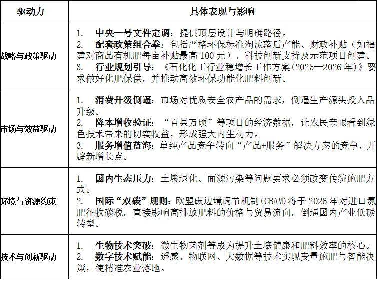 2026年中央一号文件为肥料行业绘就了清晰的绿色转型路线图。行业响应号召,已从概念探讨进入以科技创新为内核、以经济效益为验证、以多方协同为保障的实质性推进阶段。