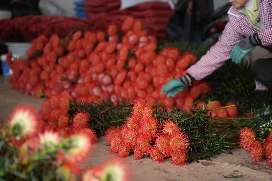 据悉,2024年,云南铭洋花卉种植有限公司经过实地考察,看中喜古乡水资源丰富、土质肥沃、气候适宜的先天优势,投资租下顺甸河畔流域450亩土地,正式开启花卉种植之路。2025年,该公司种植了五代果、天鹅绒等特色花卉,成功实现400万元的产值,为当地花卉产业发展奠定了坚实基础。今年,依托前期发展优势,公司正式转向高端花卉市场,将450亩土地全部改种澳洲公主、南非针垫两种高端木本花材。其中,澳洲公主作为西澳大利亚的特有植物,属于桃金娘科木本灌木,被誉为“澳大利亚植物群的公主”,观赏价值极高;南非针垫则是国际市场上备受青睐的鲜切花品种,花形奇特、色彩艳丽。