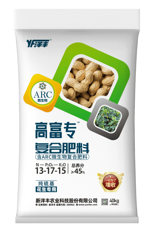 高富专ARC复合肥料由新洋丰与中国农科院油料所李培武院士团队合作研发,产品面向大豆、花生等主要油料作物,通过深入研究影响ARC菌剂活性的关键因子,新洋丰成功破解了复合肥料与微生物难兼容、易失活、肥效期短的行业难题,实现ARC菌剂与优质复合肥料高效耦合,不仅可以精准供给油料作物养分需求,更从土壤微生态源头入手,同步解决黄曲霉毒素污染与固氮效率低下的世界性难题,实现油料作物增产提质